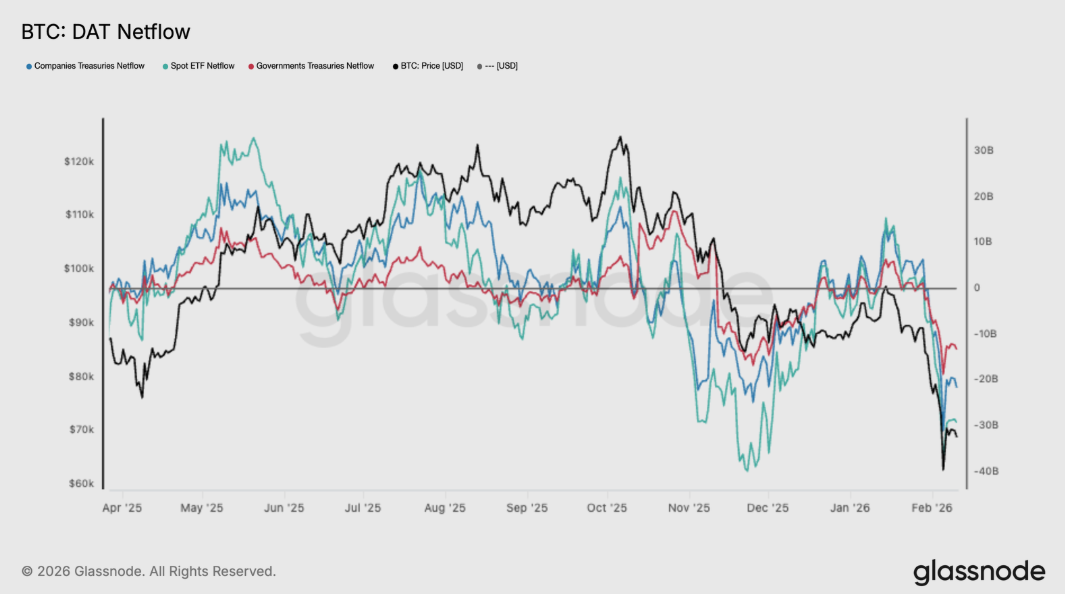 Bitcoin zároveň čelí výrazným negatívnym tokom v oblasti inštitucionálnych držieb. Spotové ETF fondy, firemné aj vládne rezervy zaznamenali súčasne čisté odlevy kapitálu, pričom práve ETF segment tvorí najväčšiu časť tohto pohybu.