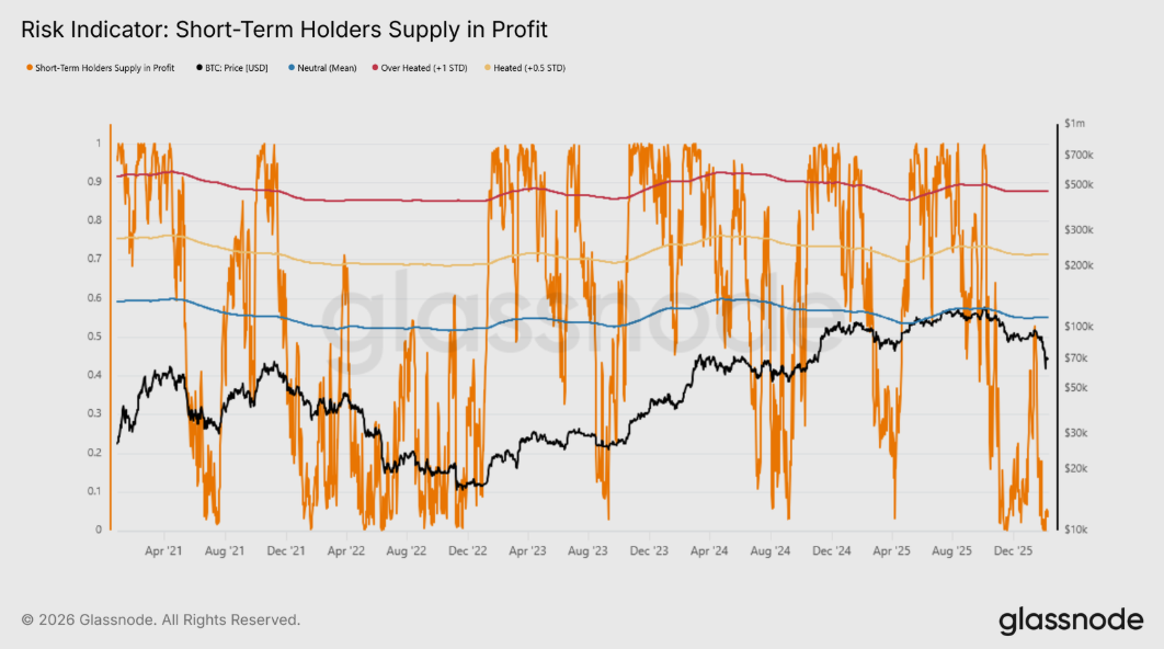 Dôležitý pohľad ponúka metrika Short-Term Holders Supply in Profit. Tá sleduje, aká časť krátkodobých držiteľov sa nachádza v zisku. V minulých klesajúcich cykloch sa odrazy ceny často zastavili v pásme, ktoré siaha od historického priemeru po +0,5 štandardnej odchýlky.