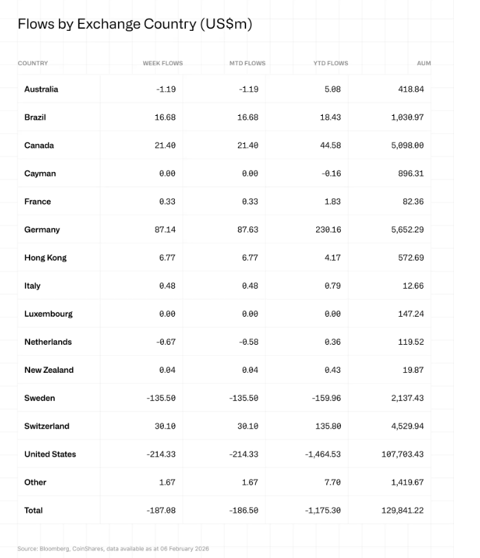 Hoci cena Bitcoinu čelila silným výkyvom, celkové odlivy z kryptofondov dosiahli minulý týždeň len 187 miliónov dolárov. CoinShares uvádza, že napriek vysokému tlaku na cenu sa odlivy z kryptomenových investičných produktov minulý týždeň výrazne spomalili. Podľa historických dát práve takéto spomalenie často naznačuje možný zlom v trhovom sentimente.