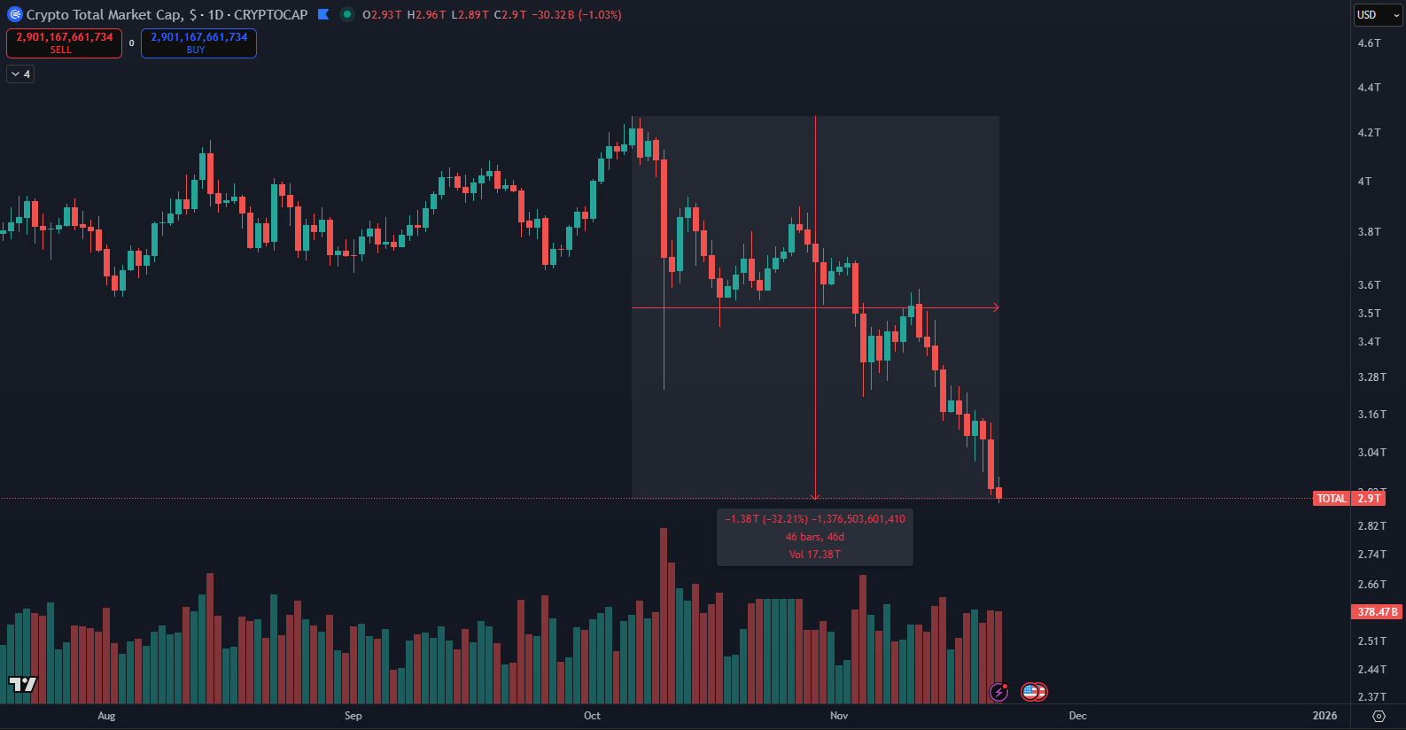 Pád kapitalizácie kryptomien. Zdroj: tradingview.com
