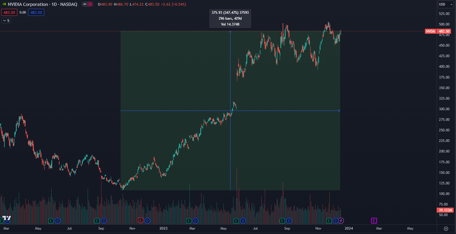 Spoločnosť má podiel až 80 % na trhu s GPU a len 13. novembra predstavila nový čip umelej inteligencie H200. Nvidia je podľa rebríčku CompaniesMarketCap 6. najväčšia firma na svete s trhovou kapitalizáciou 1,19 bilióna dolárov. Akcie spoločnosti dokonca vytvorili cenový nárast 350 % len počas 430 dní.