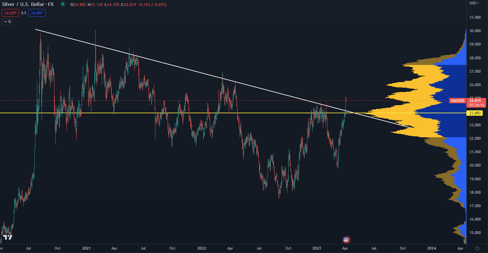 Podľa údajov z TradingView sa striebro obchoduje v čase písania článku na trhovej cene 24,82 dolárov. Okrem toho prekonalo trendovú čiaru predstavujúcu rezistenciu z maxím korekcie, ktorá dominovala na trhu od augusta 2020, kedy striebro dosiahlo maximum 29,82 dolárov.