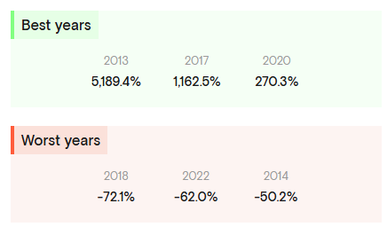 Pri investovaní do kryptomien je komplikované spoliehať sa na priemerné ročné zhodnotenie, najmä v prípade Bitcoinu, ktorý zažil obdobia extrémnych ziskov aj strát. Bitcoin zaznamenal v minulosti roky s neuveriteľnými výnosmi, ako napríklad: