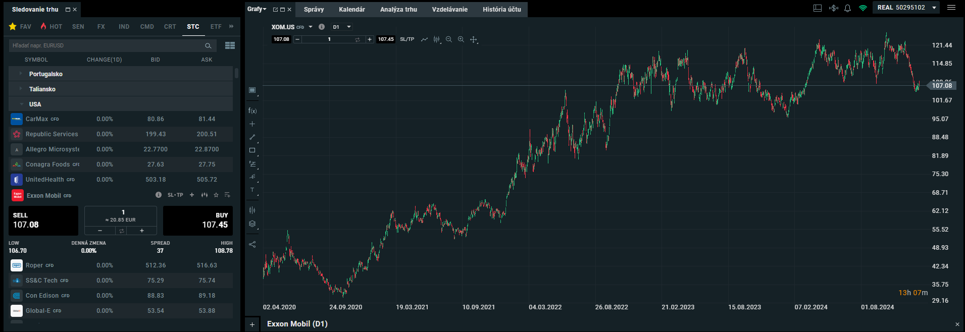 Do spoločností, ktoré patria pod energetický priemysel, dokážete jednoducho investovať pomocou populárnej investičnej platformy XTB. Obrázok vyššie zobrazuje nákup akcií Exxon Mobil.