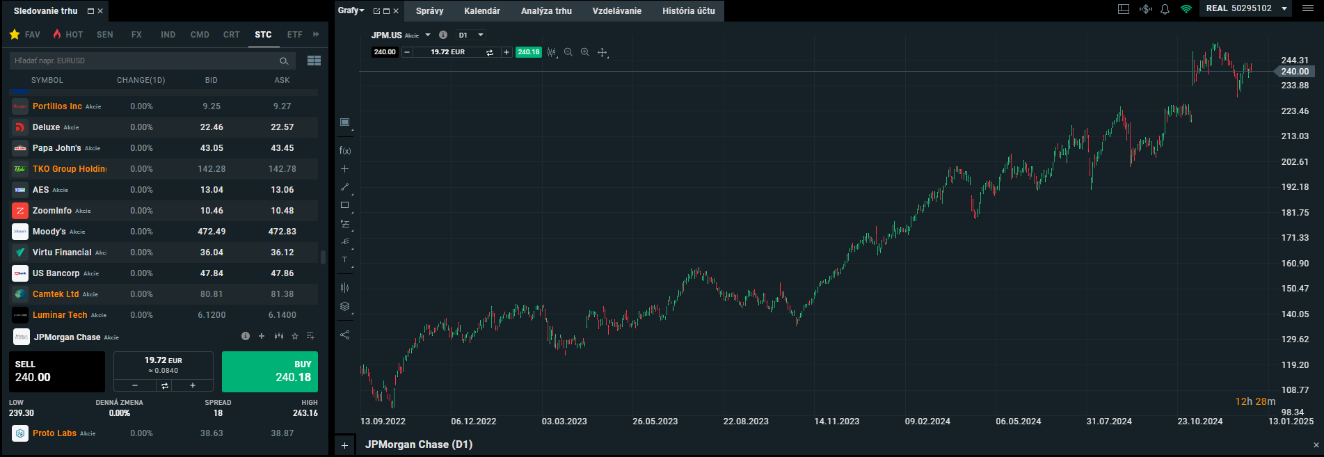Rebríček najperspektívnejších sektorov na rok 2025 v oblasti investovania uzatvárame financiami. Tento sektor sa rýchlo prispôsobuje digitalizácii a novým formám platobného styku, vďaka čomu môžu akcie firiem prudko vzrásť. A nie je prekvapením, že aj do týchto spoločností dokážete investovať na XTB. Obrázok vyššie zobrazuje jednoduchý nákup akcií JPMorgan Chase.
