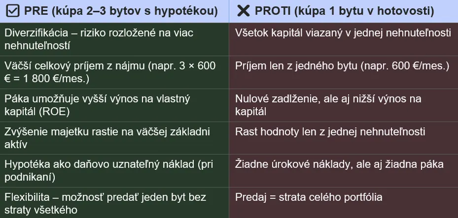 - Väčší príjem z nájmu: tri byty generujú trojnásobný mesačný cash flow oproti jednému.