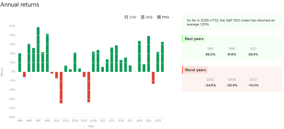 - Historická stabilita: Aj keď trhy zažívajú obdobia volatility, S&P 500 ukázal dlhodobý rast a stabilitu.