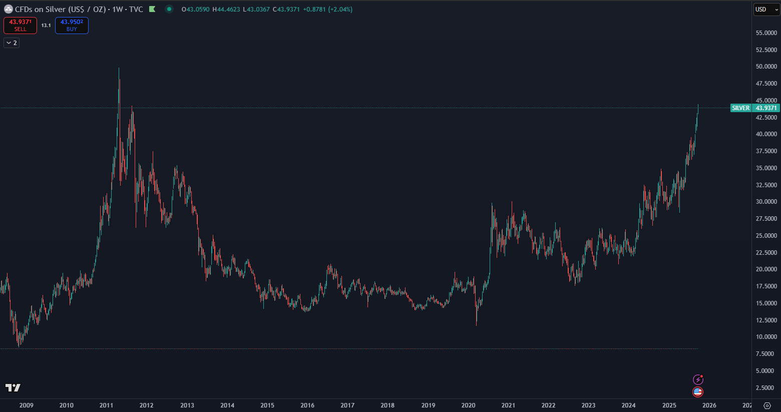 Zahanbiť sa nenechalo ani striebro, ktoré za posledný rok stúplo identicky o 43 % a dosiahlo súčasnú cenu 44 dolárov. Ide o najvyššiu hodnotu od augusta 2011, čo potvrdzuje jeho význam nielen ako investičného aktíva, ale aj ako priemyselného kovu s reálnymi využitiami. Striebro je totiž kľúčové v mnohých odvetviach moderného hospodárstva.