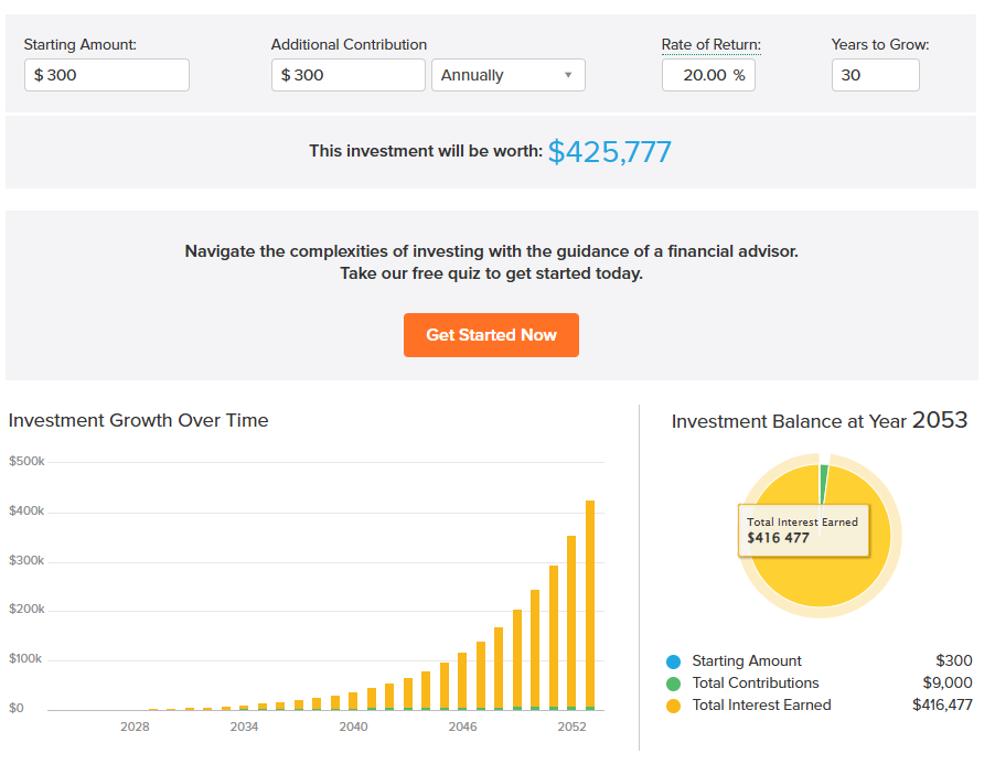 Aby ste mali lepšiu predstavu o možnom zhodnotení mesačnej čiastky 300 eur, obrázok investičnej kalkulačky nižšie demonštruje celkovú hodnotu účtu po 30 rokoch a ročnom úroku 20 % (Bitcoin dosahuje až 60 %).