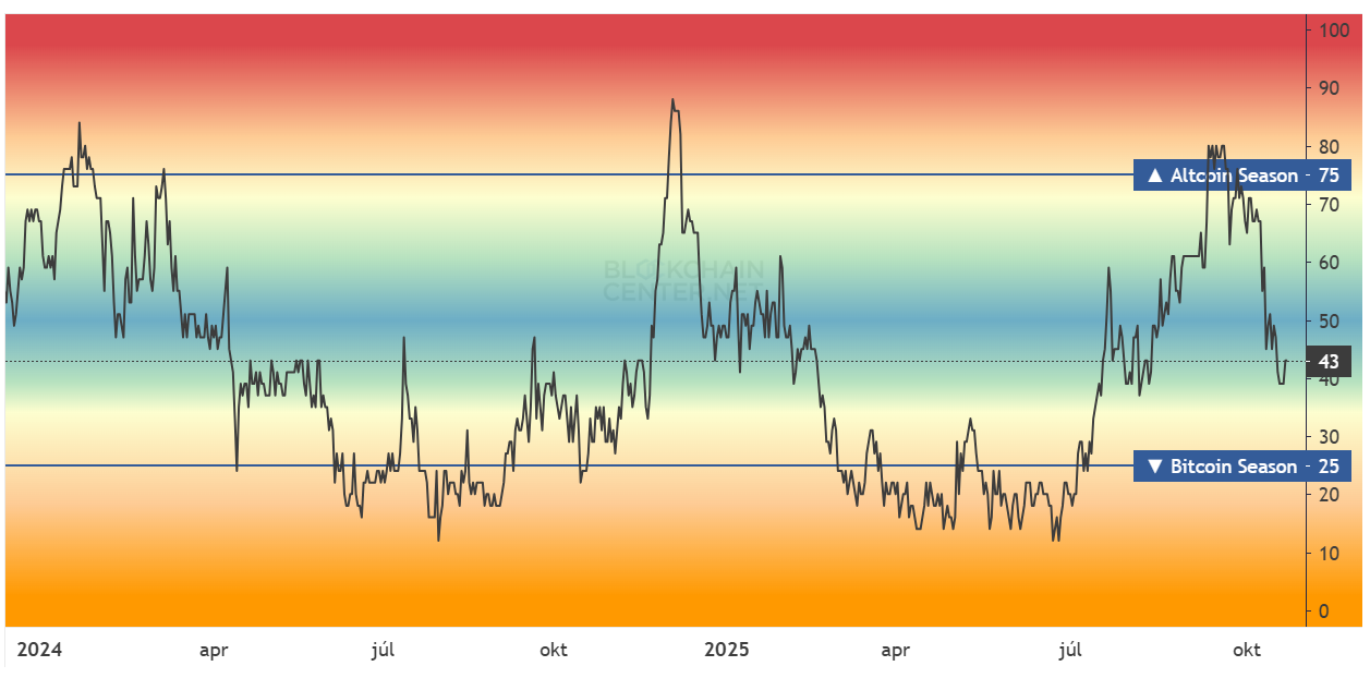 Podľa indexu altcoinovej sezóny od Blockchain Center klesla hodnota ukazovateľa na 43 bodov, čo je najmenej od augusta. Tento vývoj potvrdzuje, že altcoiny sú momentálne pod výrazným tlakom. Výsledkom tohto správania je, že dominancia Bitcoinu na trhu opäť stúpla na 60 % a nachádza sa v rastúcom trende už 40 dní po sebe. To naznačuje návrat kapitálu k hlavnému aktívu.