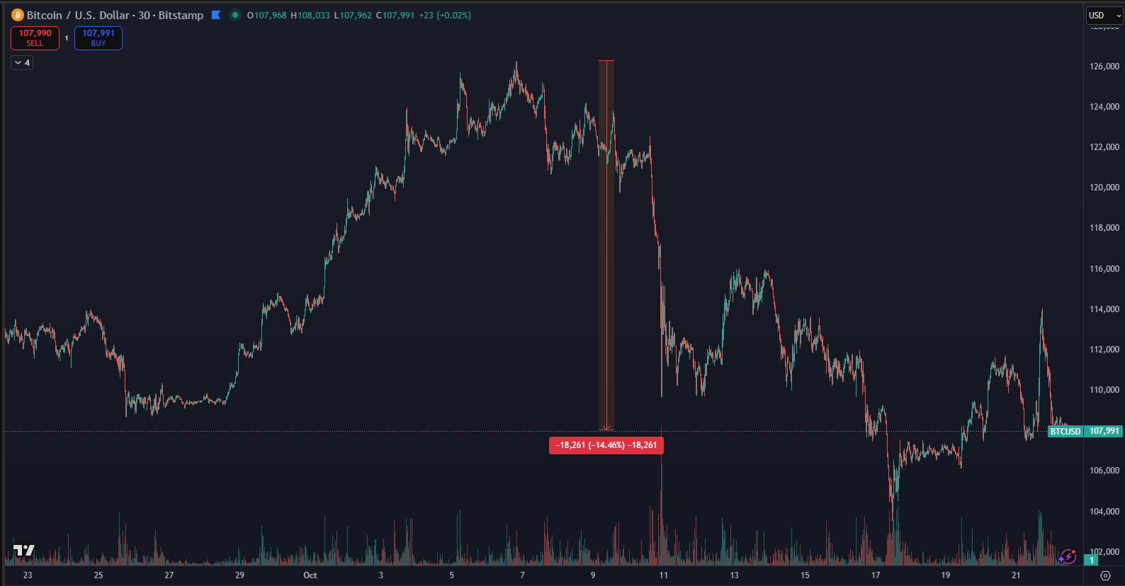Bitcoin mal výborne našliapnuté k dosiahnutiu nového historického maxima, ktoré napokon zaznamenal 6. októbra na úrovni 126 200 dolárov. Všetko nasvedčovalo tomu, že pôjde o mimoriadne úspešný mesiac, keďže podľa údajov z Coinglass Bitcoin v októbri v priemere dosahuje približne 20 % zisk.