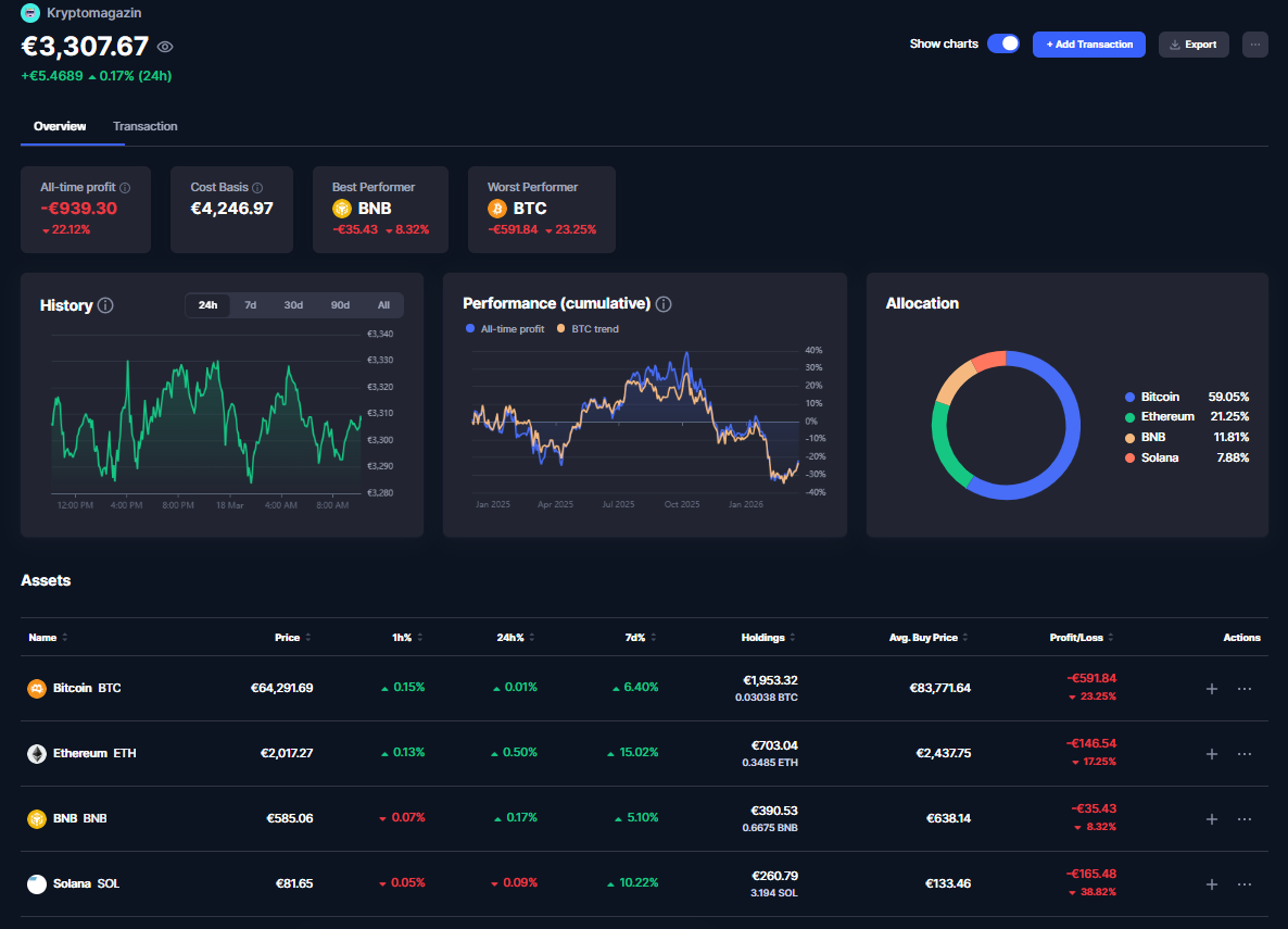 - Bitcoin (BTC): Pri priemernej nákupnej cene 83 771,64 € a aktuálnej cene 64 291,69 € vykazujete stratu 591,84 € (-23,25 %).