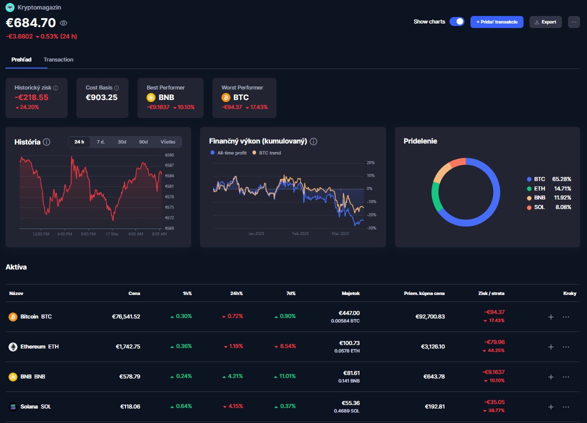 Podľa údajov z CoinMarketCap sa Bitcoin obchoduje o -17,43 % nižšie a v strate sme na ňom 94,37 eura. Ethereum kleslo dokonca o -44,25 % (79,96 eura), BNB o -10,10 % (9,16 eura) a Solana o -38,77 % (35,05 eura). Celkovo je tak naše portfólio v strate -24,20 % (218,55 eura), čo znamená, že hodnota je na úrovni 684,70 eura.