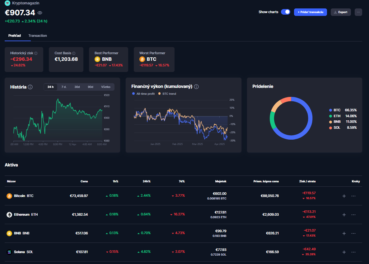 Podľa údajov z CoinMarketCap sa Bitcoin obchoduje o -16,57 % nižšie a v strate sme na ňom 119,57 eura. Ethereum kleslo dokonca o -47,01 % (113,21 eura), BNB o -17,43 % (21,07 eura) a Solana o -35,28 % (42,49 eura). Celkovo je tak naše portfólio v strate -24,62 % (296,34 eura), čo znamená, že hodnota je na úrovni 907,34 eura.