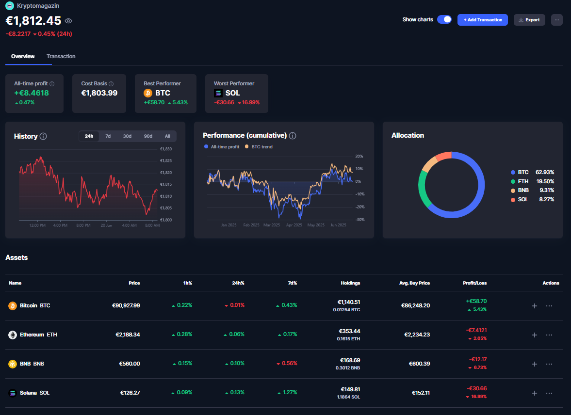 Ako vidíme, práve Bitcoin nám svojím ziskom kompenzuje všetky straty altcoinov. Vďaka tomu je celkové portfólio stále v miernom zisku 0,47 %, čo predstavuje 8,46 €. Tento vývoj potvrdzuje dôležitosť diverzifikácie a dominantného postavenia Bitcoinu na trhu.