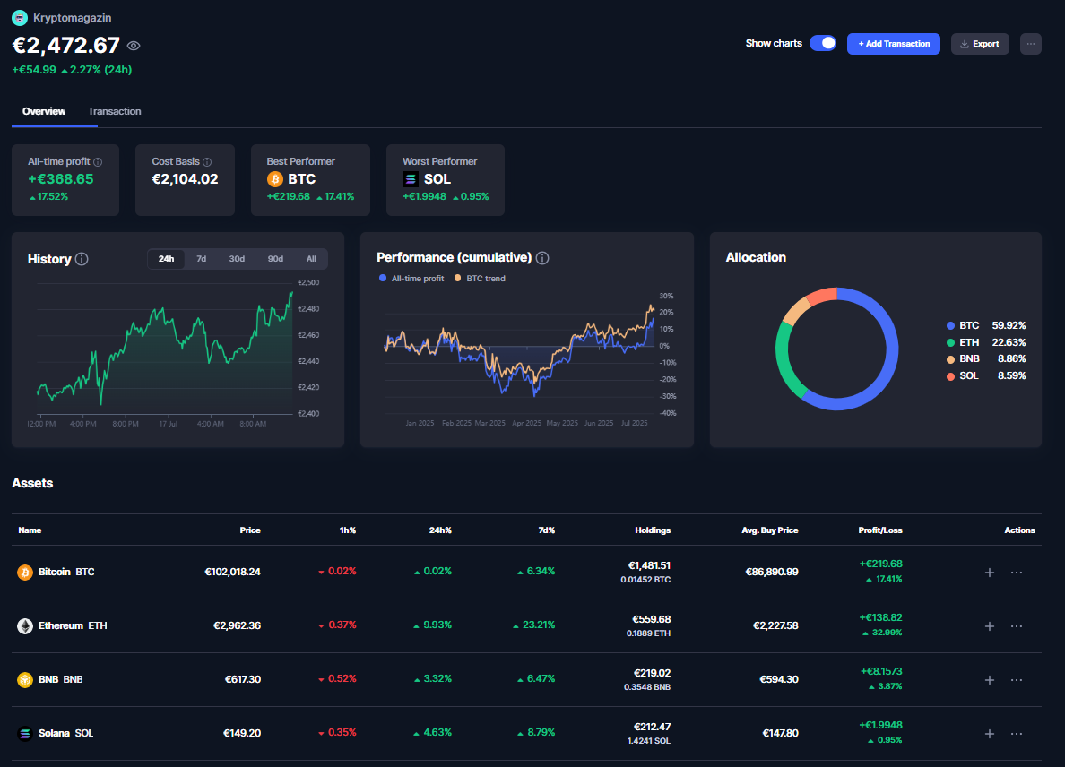 Ako vidíme, Bitcoin je síce z percentuálneho hľadiska druhý po Ethereu, no z absolútneho hľadiska je prvý kvôli tomu, že do neho investujeme viac peňazí. Výsledkom je, že celkové portfólio máme v zisku +17,52 %, čo predstavuje 368,65 €. Tento vývoj potvrdzuje dôležitosť diverzifikácie a dominantného postavenia Bitcoinu na trhu.