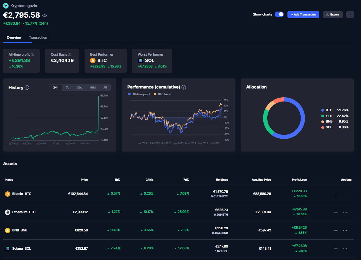 Ako každý mesiac, aj tentoraz nakupujeme kryptomeny za ďalších 300 eur podľa nášho vopred stanoveného rozdelenia. Veríme v silu pravidelného investovania bez ohľadu na aktuálnu trhovú situáciu. Rozdelenie zostáva nezmenené – Bitcoin 180 €, Ethereum 60 €, Solana 30 € a Binance Coin 30 €.