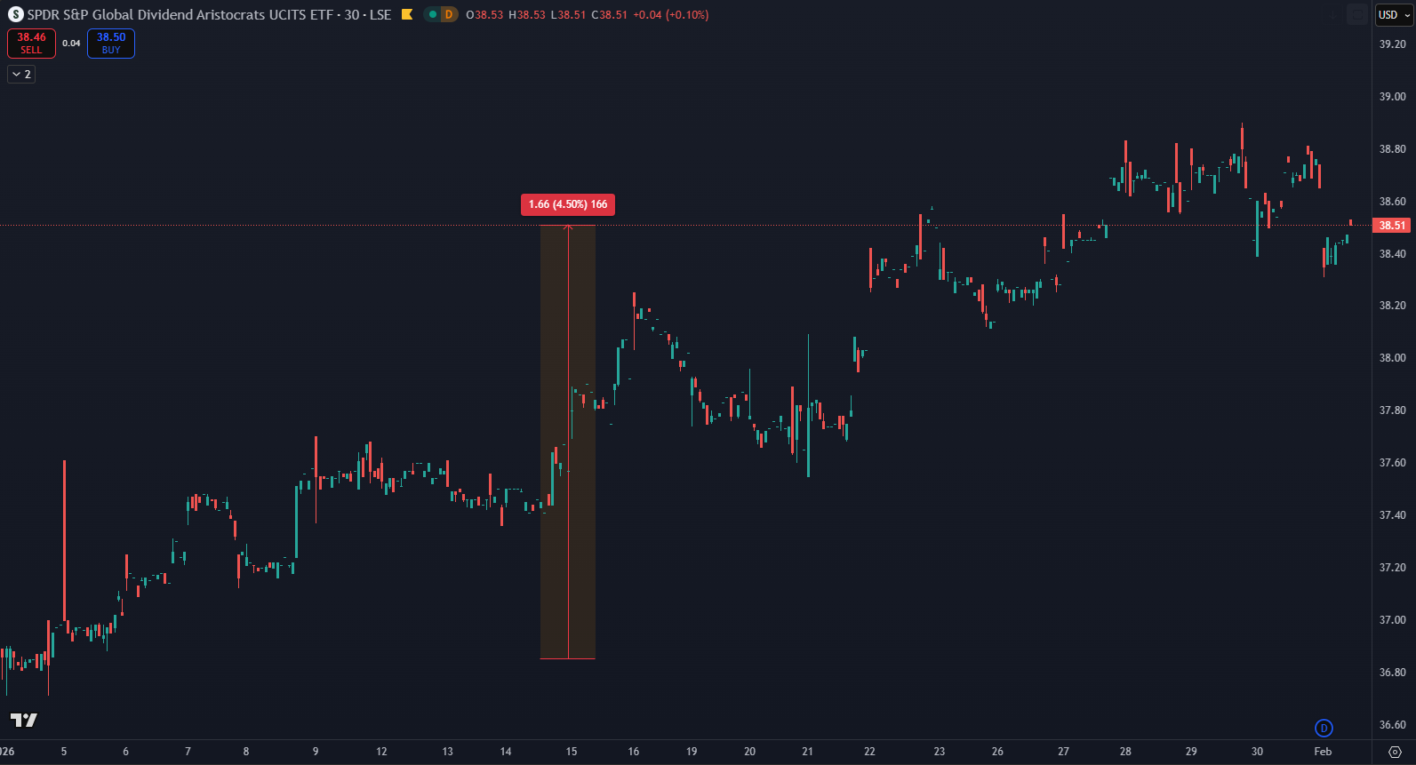 - ETF SPDR S&P Global Dividend Aristocrats UCITS – expozícia voči indexu zahŕňajúcemu akcie spoločností s dlhodobou históriou stabilných alebo rastúcich dividend – 1 401,39 €