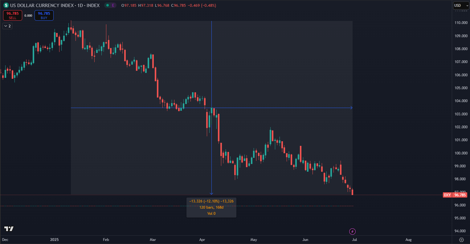 - Oslabenie doláru: Dolár je už niekoľko rokov pod tlakom spôsobeným narastajúcim verejným dlhom USA, infláciou a menovou politikou Fedu. Slabší dolár môže mať rôzne dopady na naše portfólio. Pre investorov je preto dôležité sledovať pohyb dolára, pretože menové fluktuácie ovplyvňujú nielen hodnotu amerických ETF, ale aj celkové zhodnotenie investícií. Dolárový index DXY stratil za 170 dní až 12 % svojej hodnoty.