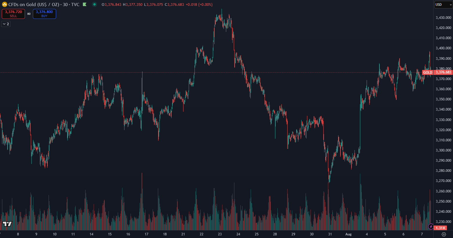 Zlato pokračuje v stabilnom raste, ktorý je podporovaný zvýšeným geopolitickým napätím a pretrvávajúcimi obchodnými vojnami. Počas júla dosiahla jeho cena vrchol na úrovni 3 438 dolárov. V závere mesiaca však prišla očakávaná korekcia, ktorá stlačila cenu až na 3 270 dolárov. Odvtedy sa trh opäť postupne spamätáva a zlato si udržiava povesť bezpečného prístavu v neistých časoch.
