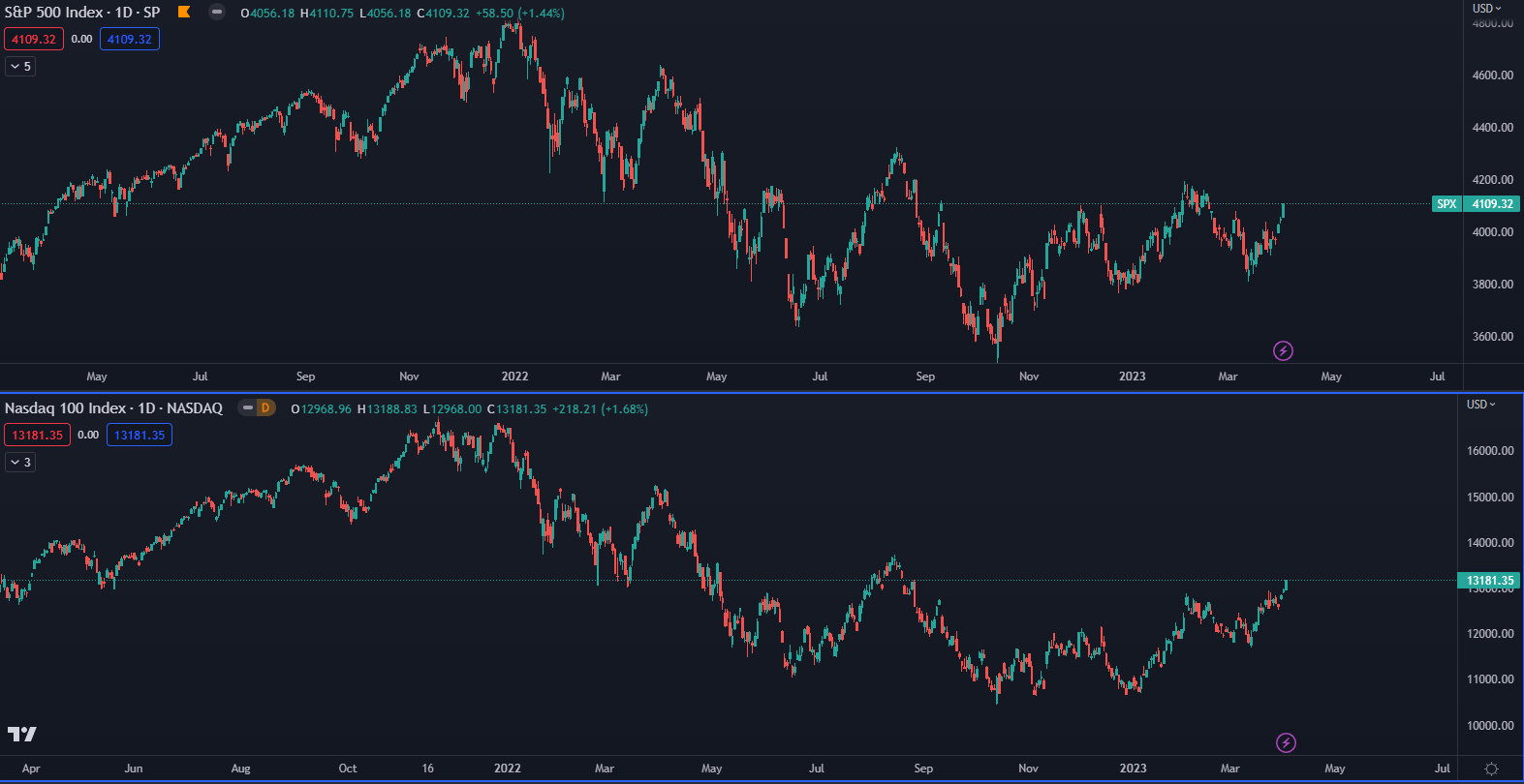 V čase písania článku sa akciový index S&P 500 (SPX) obchoduje podľa údajov TradingView na trhovej cene 4109 bodov a Nasdaq (NDX) na hodnote 13 181 bodov. Rok 2022 znamenal pre SPX korekciu 27 % a pre NDX až 36 %. Ak by sa ekonomika prevalila do hlbokej recesie je pravdepodobné, že by ceny akcií klesli opäť na nové minimum.