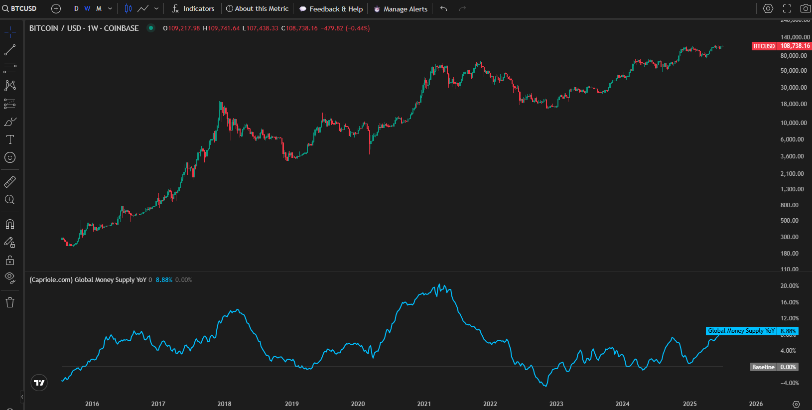 Podľa údajov Capriole globálna peňažná zásoba zaznamenala medziročný 9 % nárast. Tieto prudké nárasty globálnej fiat zásoby v minulosti predchádzali významným rastom na trhu s kryptomenami. V auguste 2017 nasledoval po signáli rast o 663 %, v novembri 2017 o 136 % a v júni 2020 dokonca o 580 %. V priemere tak Bitcoin v obdobiach po takýchto signáloch zaznamenal zhodnotenie o 460 %.