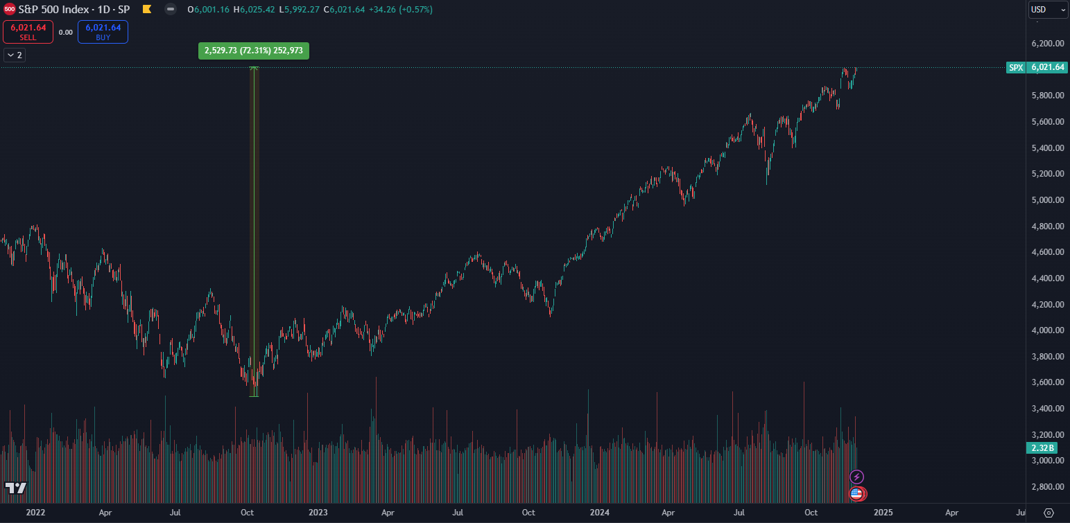Na grafe nižšie je zobrazený dlhodobý rastúci trend od minima z októbra 2022. Za tento časový úsek dokázal index stúpnuť o 72,31 %. Ako môžete vidieť, za posledné dva roky sme boli svedkami len krátkodobých poklesov, z ktorých bol najdlhší od augusta po október 2023.