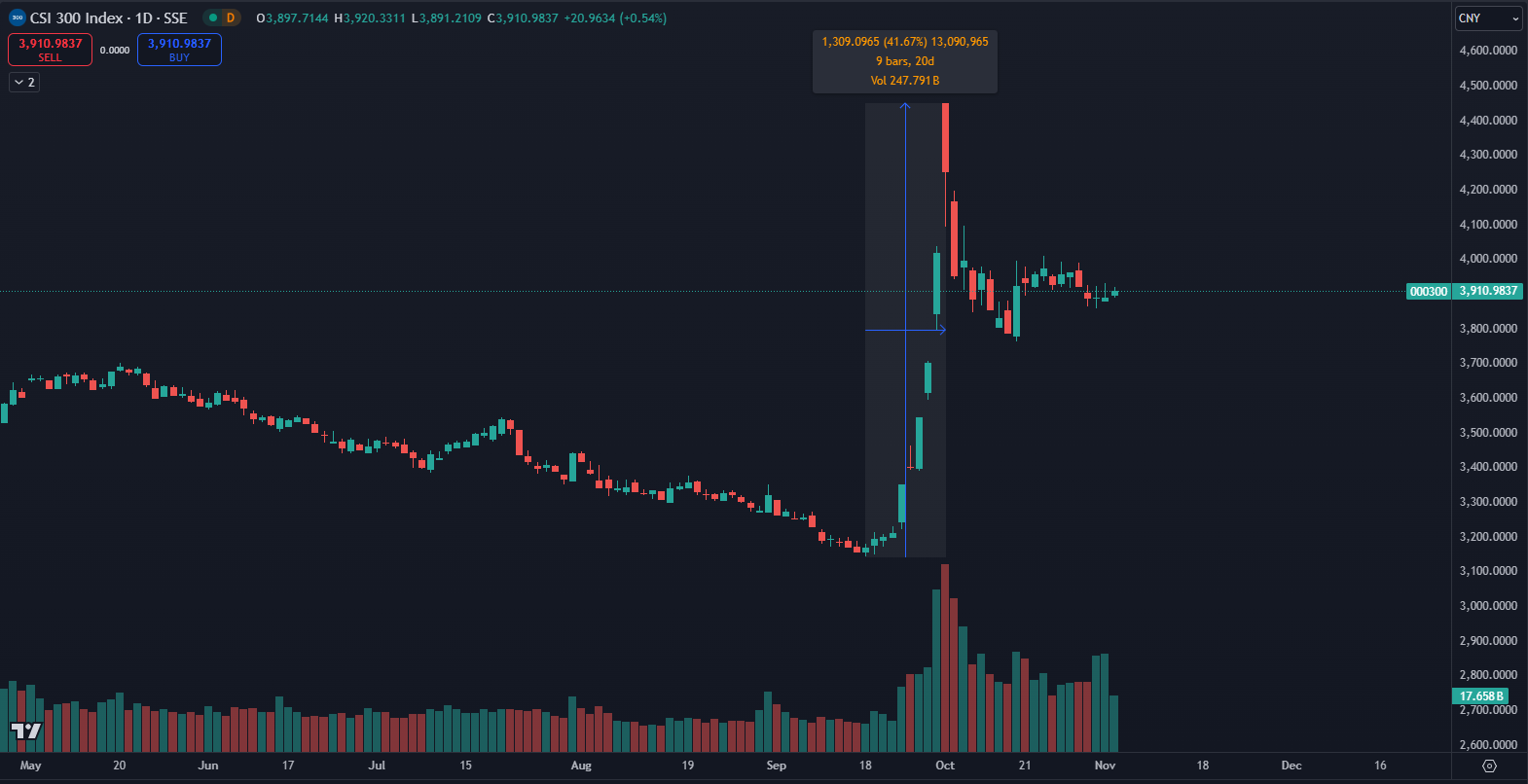 Obrovský nárast indexu CSI 300. Zdroj: TradingView