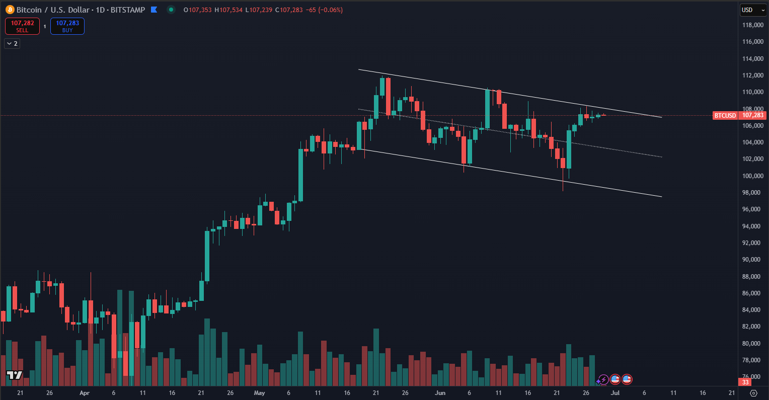 BTC sa podľa údajov TradingView aktuálne obchoduje tesne pod historickým maximom, na úrovni približne 107 283 dolárov v čase písania. Trh sleduje kritickú rezistenciu, ktorá sa nachádza len o niekoľko tisícok dolárov vyššie. Ak dôjde k jej presvedčivému prerazeniu, je veľmi pravdepodobné, že Bitcoin vytvorí nové historické maximum.
