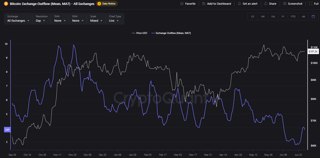 Bitcoin zažil počas tohto týždňa zaujímavý technický zlom. Podľa dát z Cryptoquant dosiahli 7-dňové priemerné výbery z búrz nárast o viac než 172 %, zatiaľ čo prílevy klesli o takmer 6 %. Tento jav naznačuje akumulačnú fázu – investori vyberajú mince z búrz, čím znižujú pravdepodobnosť ich predaja v blízkej budúcnosti.