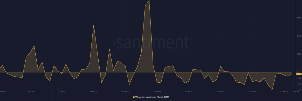 Napriek technicky priaznivému vývoju, sentiment ostáva krehký. Podľa dát zo stránky Santiment dosiahol vážený sentiment hodnotu -0,12, čo znamená mierny pesimizmus. Po prudkých výkyvoch v máji investori zatiaľ nezaujali jasnú pozíciu a nálada je stále ovplyvnená neistotou.