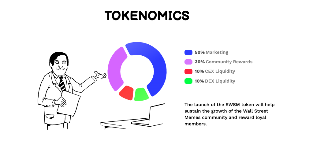 Tokenomika projektu Wall Street Memes je tiež prepracovaná. Tím plánuje venovať 50% na marketing, celých 30% na komunitné odmeny a zvyšných 20% na uvedenie tokenu $WSM na burzy CEX a DEX. Ide o jeden z najväčších percentuálnych podielov, aké sme kedy videli na komunitné odmeny. Projekt si je totiž dobre vedomý toho, že za úspechom meme coinov zvyčajne stojí silná komunita.