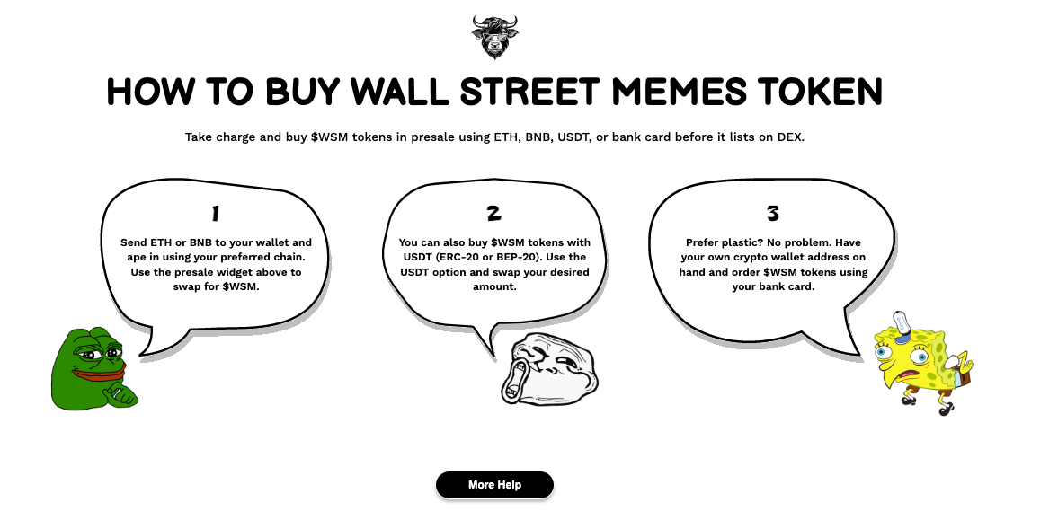 Aby ste si mohli kúpiť tokeny $WSM v predpredaji, budete na to potrebovať kryptopeňaženku. Tú stačí pripojiť k predpredaju na webovej stránke Wall Street Memes a zakúpiť si tokeny $WSM za ETH alebo USDT. Prípadne môžete použiť aj debetnú alebo kreditnú kartu.