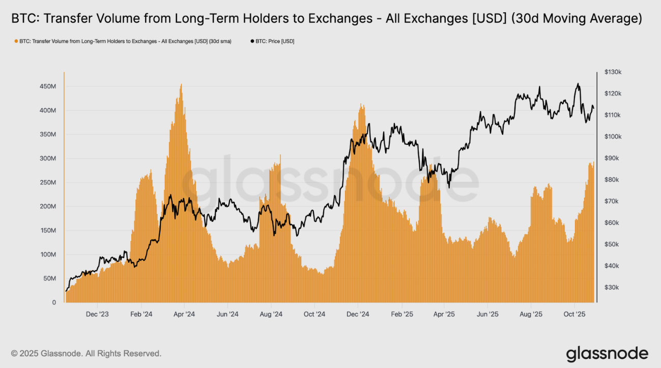 Druhou dôležitou metrikou, ktorá naznačuje vývoj na trhu, je Transfer Volume from LTHs to Exchanges (30D-SMA). Ide objem Bitcoinov, ktoré dlhodobí držitelia presúvajú na burzy s cieľom ich predaja. Tento ukazovateľ zaznamenal prudký nárast na úroveň 293 miliónov dolárov denne, čo je viac ako dvojnásobok oproti bežnému rozsahu medzi 100 až 125 miliónmi dolárov, ktorý prevažoval od novembra 2024.