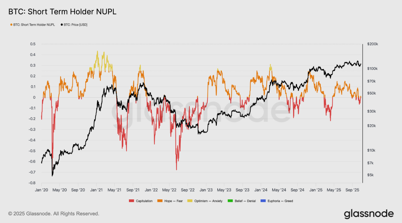 Správanie krátkodobých držiteľov sleduje metrika Short-Term Holder Net Unrealized Profit/Loss (STH-NUPL), ktorá meria nerealizovaný zisk alebo stratu v pomere k trhovej kapitalizácii.