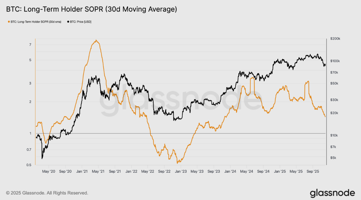 Bitcoin a metrika LTH SOPR. Zdroj: glassnode.com
