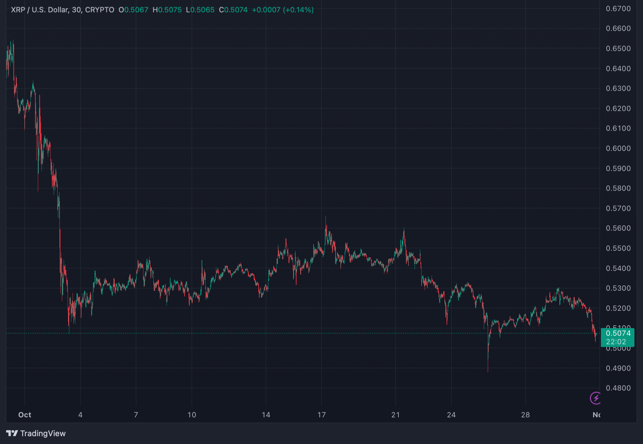 - XRP si zatiaľ udržiava stabilnú pozíciu nad 50 centov, no s menším potenciálom rastu.