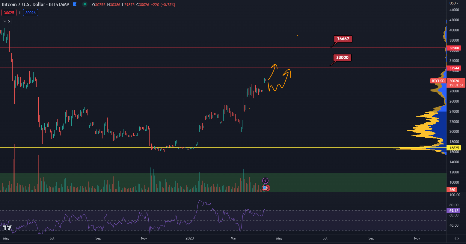 Podľa údajov z TradingView môžeme vidieť, že bitcoin sa v čase písania článku obchoduje na cene 30 026 dolárov. Ani raz v priebehu posledných mesiacov nedošlo k silnejšej reakcii predávajúcich a korekcie boli iba striedme. Práve sledujeme ďalší rastúci leg na jeho počiatku s cenovými cieľmi 33 000 a 36 600 dolárov v prípade, že súčasná rezistencia nebude rešpektovaná.