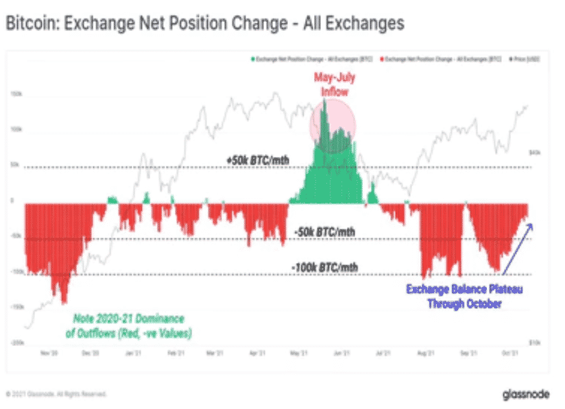 Kryptoburzy zaznamenávajú mierny odliv Bitcoinov. Odliv zvyčajne znamená, že obchodníci sa rozhodujú uložiť svoje bitcoiny do peňaženiek. Očakávajú vyššie ceny namiesto toho, aby držali BTC na burze s cieľom nakupovať alebo predávať. Máj/júl bol primárnym obdobím čistého prílevu. To sa však podľa metriky od Glassnode úplne obrátilo.