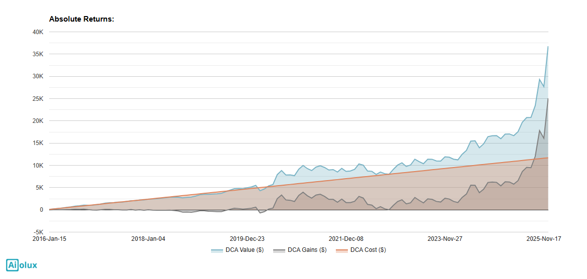 DCA v kombinácii so zloženým úrokom výrazne zvyšuje celkový výnos. Zložený úrok umožňuje, aby sa výnosy z investície reinvestovali a generovali ďalšie zisky. Aj relatívne malé mesačné investície, ako 100 €, sa takto dokážu po rokoch premeniť na značnú sumu. Pravidelné investovanie a reinvestovanie výnosov vytvára efekt „snehovej gule”, ktorý postupne naberá na sile a umožňuje dosiahnuť dlhodobé finančné ciele aj pri menších čiastkach.