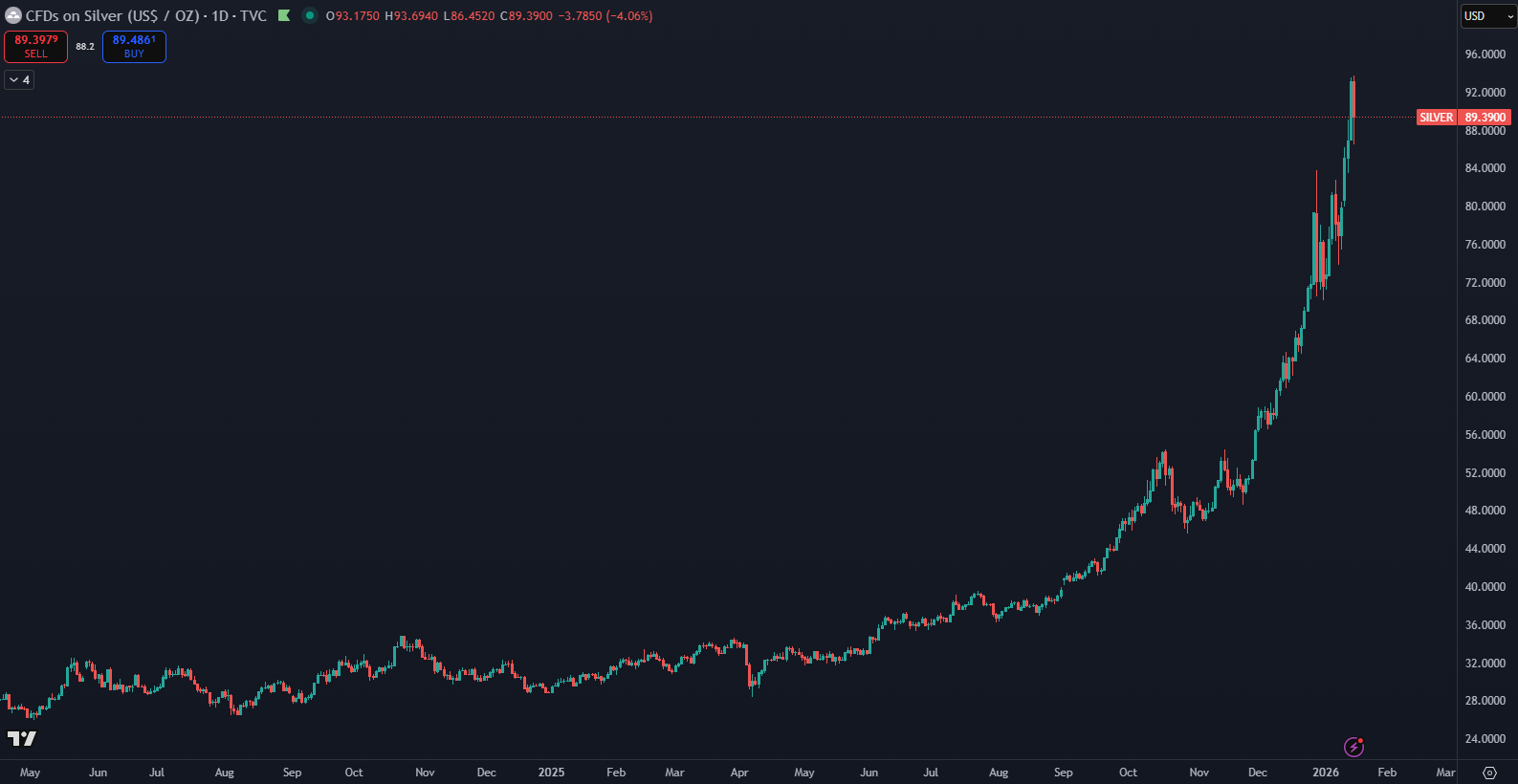 Ešte v apríli 2025 sa cena striebra pohybovala okolo 28 dolárov za uncu, ukazujú údaje TradingView. Trh však zaznamenal mimoriadne silný dopyt, ktorý cenu v krátkom čase posunul až na približne 90 dolárov. Takýto nárast predstavuje historicky najsilnejší vzostup, aký trh so striebrom kedy zažil. Investori reagovali na kombináciu obmedzenej ponuky, rastúceho priemyselného využitia a zvyšujúceho sa záujmu o reálne aktíva v období ekonomickej neistoty.