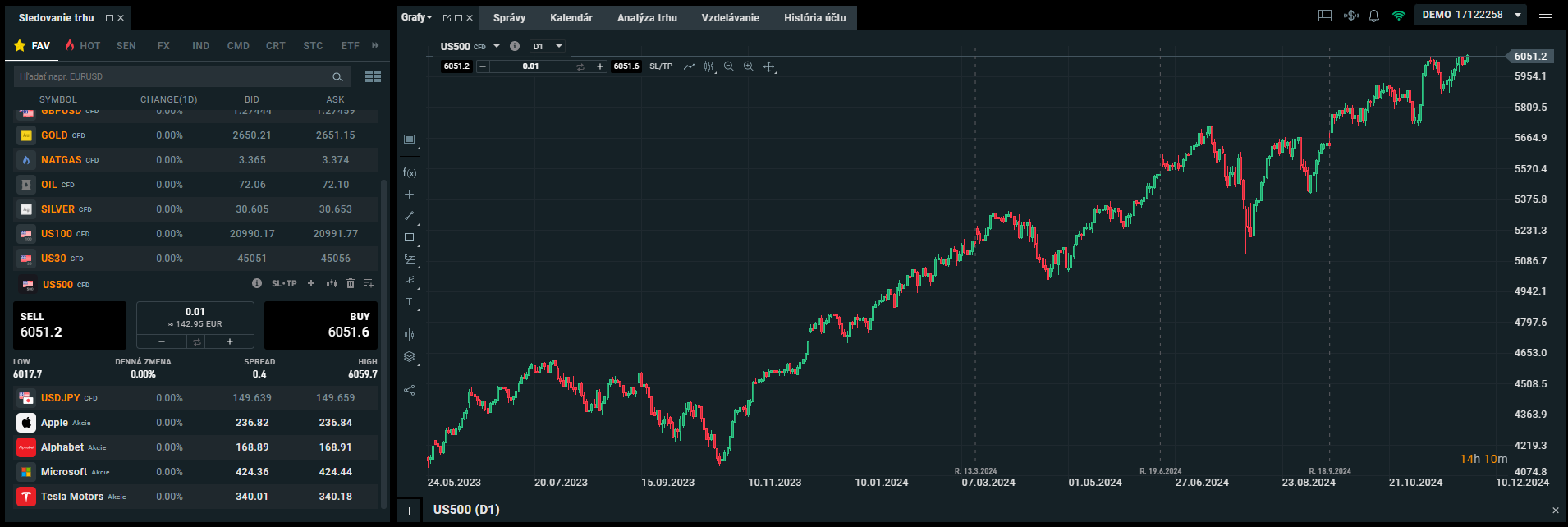 Nástroj, ktorý sleduje na XTB index S&P 500 sa nazýva US500. Vy si ale viete vybrať z viac než 1 500 obchodných inštrumentov, čím umožňuje diverzifikáciu portfólia a prístup k rozmanitým trhom.