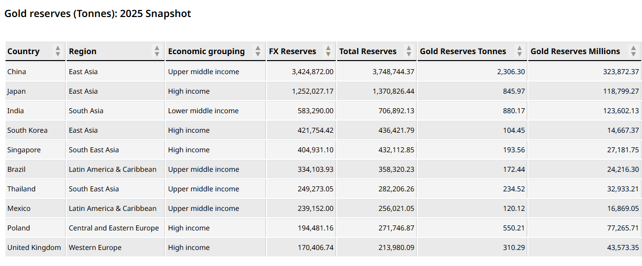 Rezervy zlata podľa krajín. Zdroj: gold.org