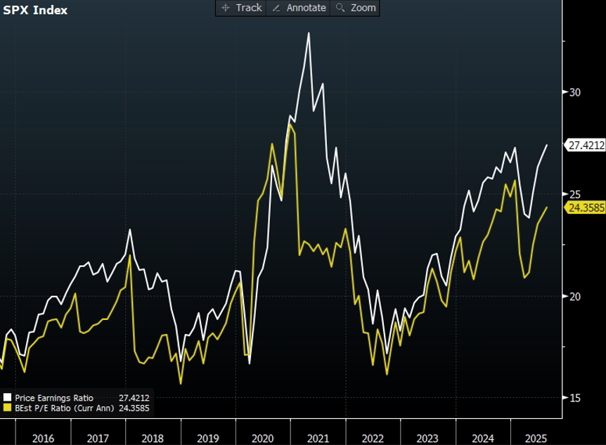 V auguste 2025 sa americké akcie obchodujú blízko historických maxím na úrovni 27,4-násobku zisku (24,4-násobku očakávaného zisku). Ide o historicky vysoké ocenenie.