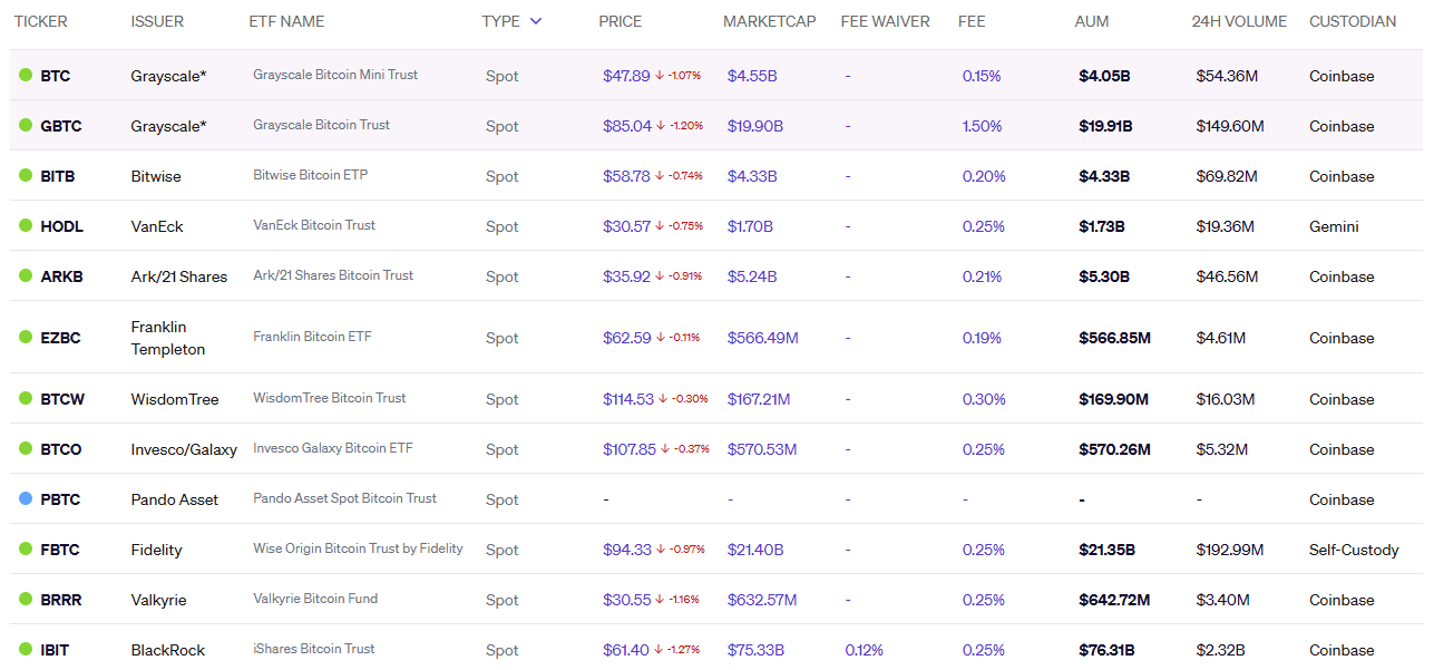 Zoznam spotových ETF pre Bitcoin. Zdroj: blockworks.co