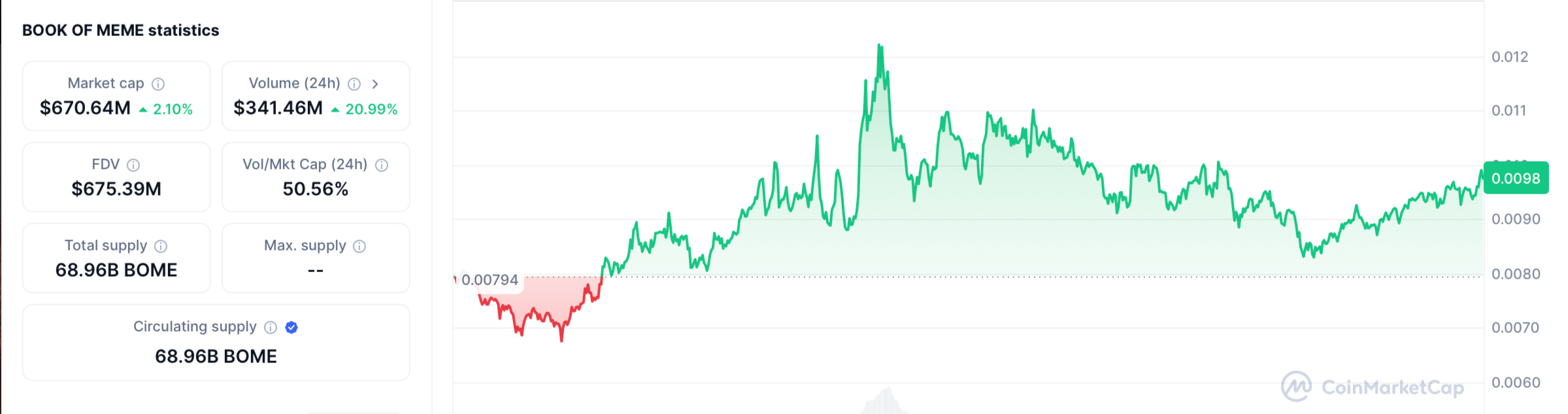 BOOK OF MEME (BOME) je experimentálny projekt zameraný na redefiníciu web 3.0 kultúry kombináciou memov, decentralizovaného úložiska a obchodovania. Snaží sa zachytiť vyvíjajúcu sa meme kultúru v digitálnej zbierke, zachovávajúc každý meme na blockchaine. Memecoin BOME funguje na Solane, využívajúc Arweave a IPFS pre úložisko, s plánmi na rozšírenie na Bitcoin inscriptions pre nemenné úložisko. Tento prístup má v úmysle urobiť memy nezastaviteľnými a zaviesť nový rozmer do decentralizovaných sociálnych médií. Potenciál mince spočíva v jej jedinečnej integrácii kultúrnych prvkov s blockchain technológiou, čo by ju mohlo urobiť atraktívnou pre tých, ktorí sa zaujímajú o inovatívne krypto projekty v súčasnom trhovom cykle.