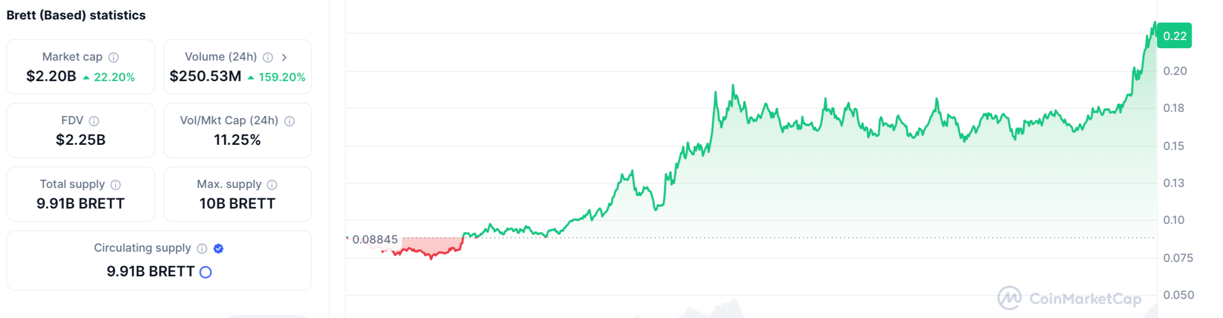 BRETT je kryptomenový token na Base Chain, známy ako Pepeho najlepší priateľ a maskot reťazca. Stojí ako významná kultúrna ikona v rámci kryptokomunity. Ekosystém Base Chain rýchlo rastie, s mnohými vyvíjanými projektmi a aplikáciami. Toto rozšírenie poskytuje pevný základ pre BRETT, umožňujúc mu ťažiť zo zdieľaných zdrojov a odborných znalostí. Ako ekosystém rastie, BRETT má potenciál prosperovať a rozširovať svoje ponuky. V súčasnom trhovom cykle sa BRETT javí ako atraktívny vďaka svojmu silnému spojeniu s expandujúcim Base Chain a jeho kultúrnej relevancii v kryptopriestore.