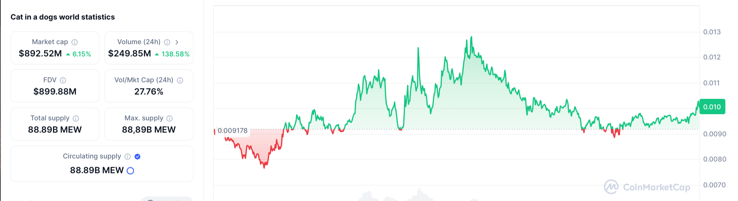 MEW je kryptomena predstavujúca token s mačacou tematikou na trhu dominovanom psími coinmi ako Dogecoin a Shiba Inu. Jej cieľom je vyniknúť ponúkaním jedinečných funkcií a využívaním technológie v prospech používateľov. Cieľom MEW je poskytovať hodnotu a inovácie, potenciálne vrátane rýchlejších transakcií, nižších poplatkov alebo zvýšenej bezpečnosti. Zameraním sa na používateľskú skúsenosť sa MEW snaží vybudovať silnú komunitu okolo svojej platformy. V súčasnom trhovom cykle môže MEW prilákať investorov hľadajúcich nové príležitosti mimo zavedených tokenov. Jeho potenciál závisí od adopcie a úžitkovej hodnoty, ktorú prináša do kryptomenového ekosystému. Tí, ktorí sa zaujímajú o vznikajúce kryptomeny, môžu považovať MEW za príťažlivý vďaka jeho charakteristickej téme a inováciám.