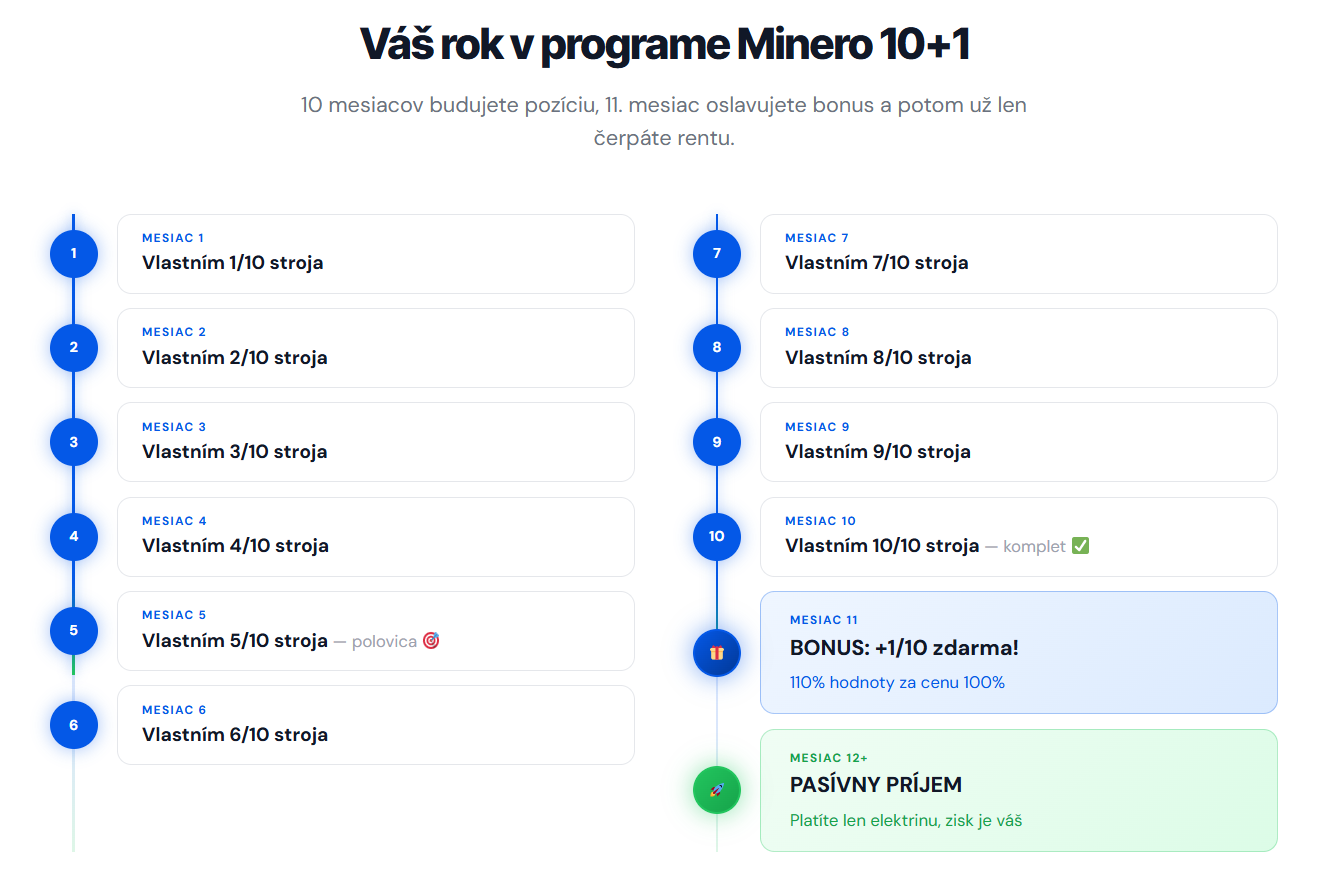 Na záver treba zdôrazniť, že celý proces zvládnete jednoducho cez Minero.sk. Platforma vás prevedie výberom programu, nastavením pravidelnej investície aj sledovaním výnosov. Podielová ťažba funguje tak, že postupne získavate podiely na reálnom ťažobnom zariadení. Po naplnení programu začnete inkasovať pasívny príjem, pričom platíte len náklady na elektrinu a zvyšok zisku ostáva vám. Minero.sk ponúka transparentné podmienky, prehľadné štatistiky a podporu, ktorá vám pomôže vybudovať dlhodobý bitcoinový príjem bez potreby vlastniť a prevádzkovať technológiu.