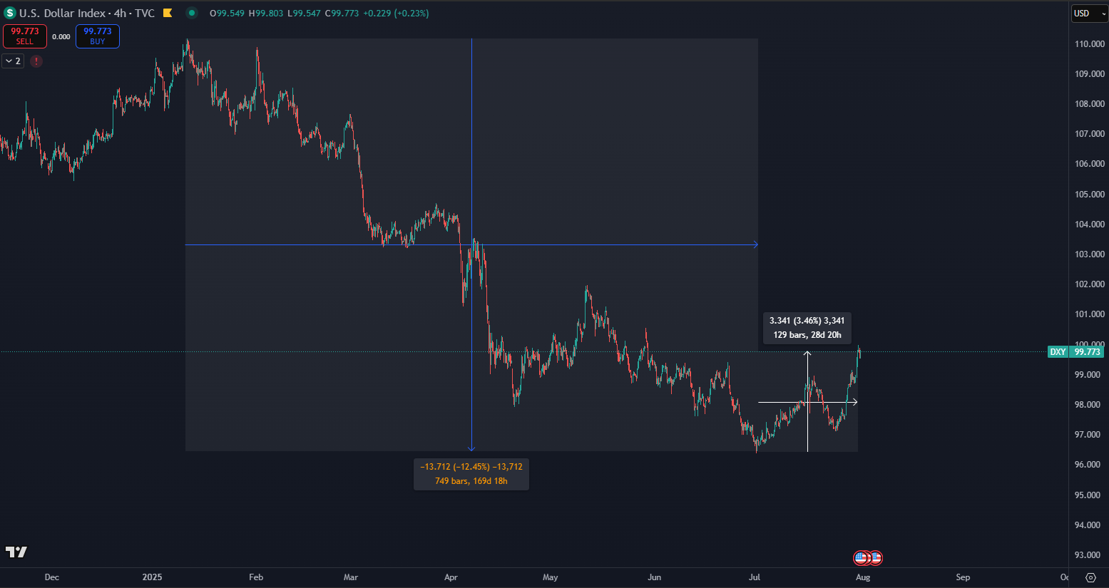 Tento vývoj bol spôsobený neistotou okolo obchodných dohôd a obavami z dopadov vysokých ciel. V poslednom mesiaci však DXY zaznamenal mierne ozdravenie o 3,46 %, čo súvisí s úspešnými dohodami s viacerými krajinami a výrazne nižšími tarifami, než sa pôvodne očakávalo.